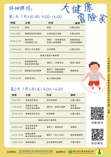 我們會利用遊戲和專業人員的分享,讓學童認識到慢性病的威脅、理解不良生活型態與疾病間的關聯性,並學習如何預防慢性病,進一步強調健康促進的重要性。我們期待藉由這次的夏令營,能夠教導學童建立健康的生活型態,讓他們成為健康的推動者,將這些重要的訊息帶回家,並影響更多的人。