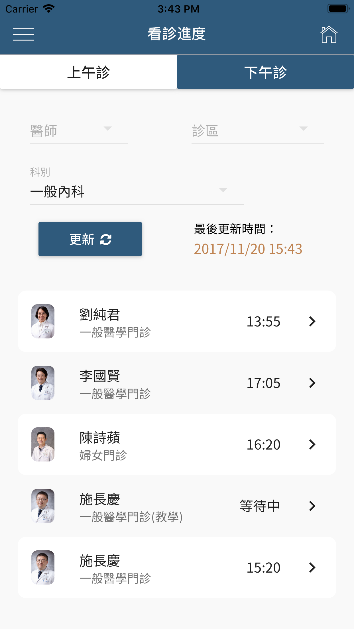 3. 看診進度: 可依科別查看目前燈號或點選親友查看當日的看診進度。